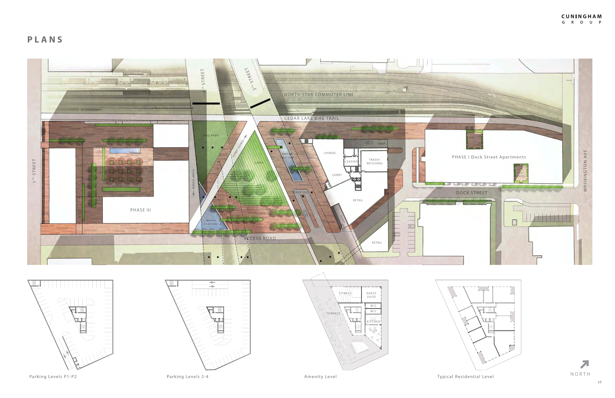 The North Loop Green is a development opportunity for an urban property adjacent to a busy elevated highway located near downtown Minneapolis. It is situated in the historic Warehouse District, known for its industrial buildings and rail lines, which served as an inspiration for the new development. To maximize the development potential of the irregular trapezoid-shaped site, we had to consider several factors. We explored three options for massing, including a podium for parking and an amenity deck for the residential tower or towers. We also had to address several site challenges, such as resolving conflicts between movement systems and modes. Additionally, we overcame the "under the bridge" perception and provided safe access options between levels. Sustainability strategies were at the forefront of the project, and we studied the site's location, water usage, energy, materials, and indoor quality to ensure that the development is sustainable and environmentally friendly.